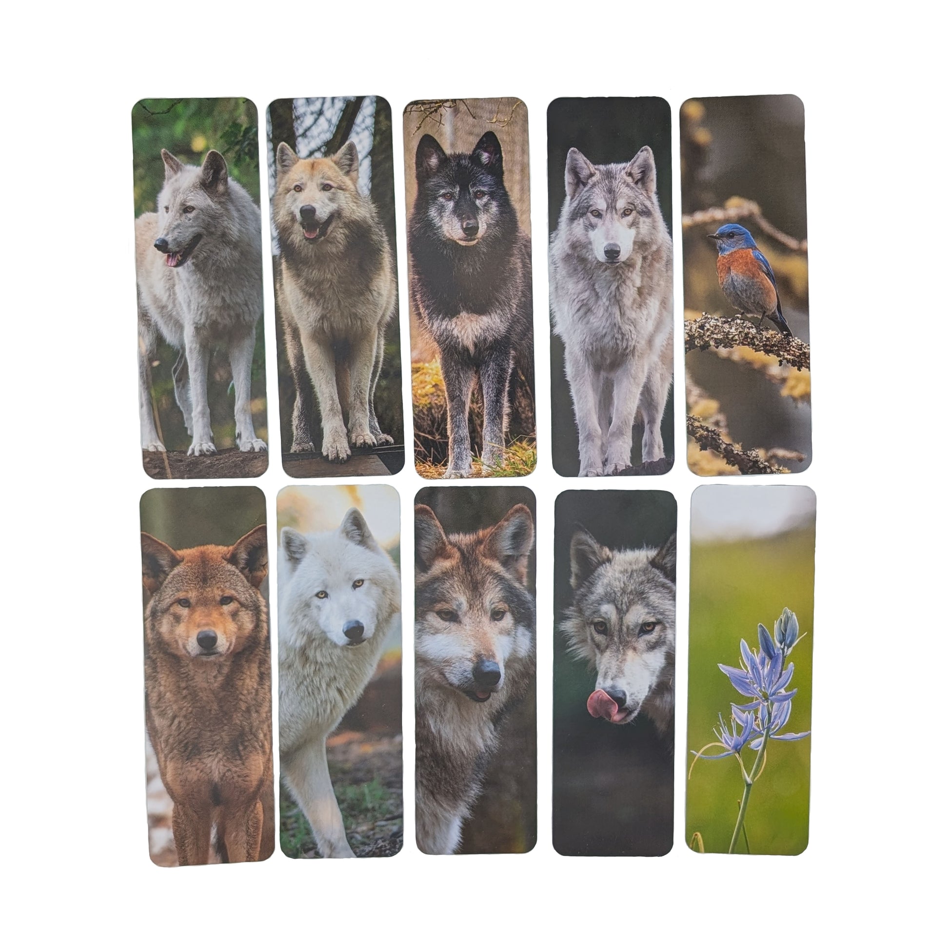 Paper bookmarks printed for Wolf Haven International with photos of resident wolves, prairie inhabitants, and educational information. Measured 2 x 6 inches.