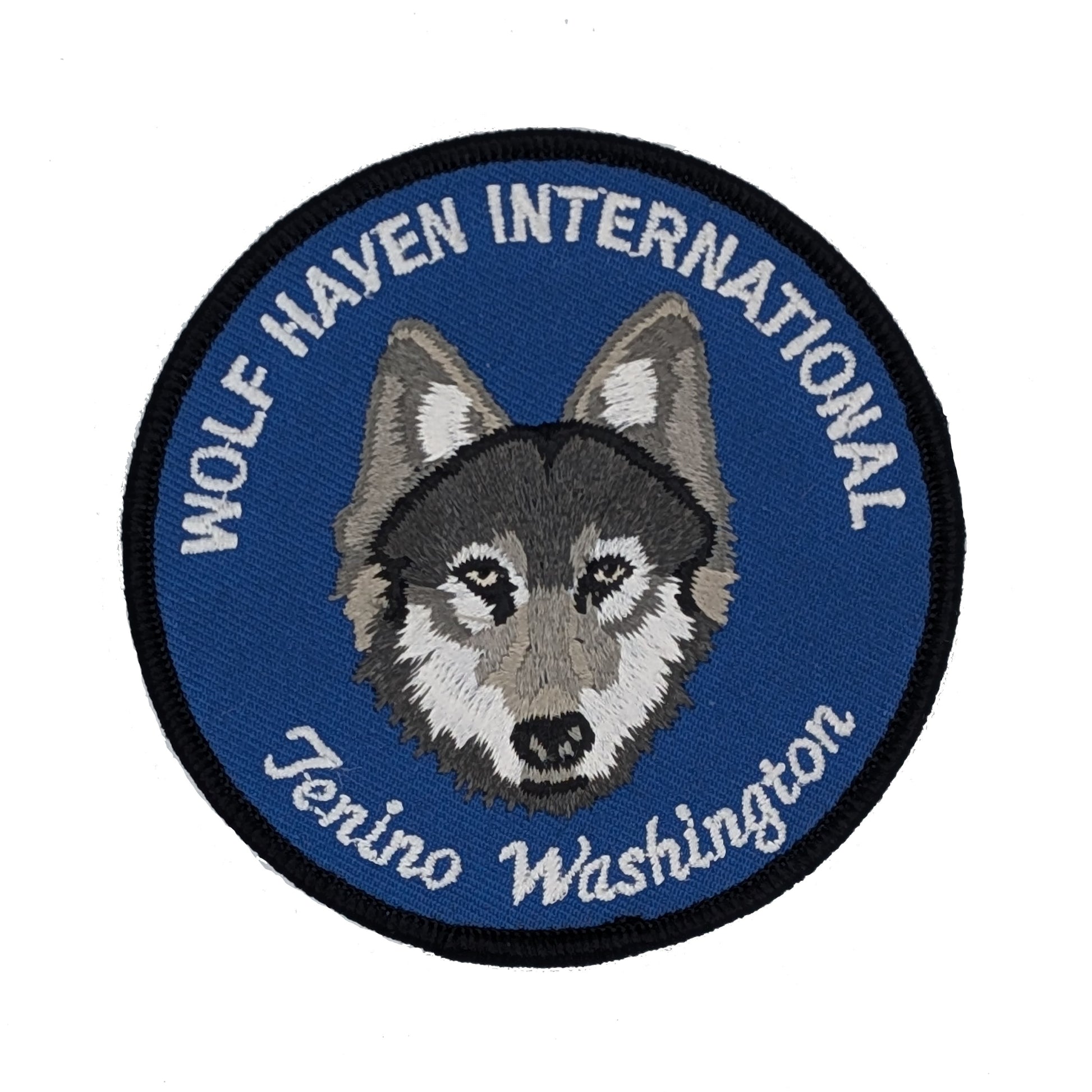 This brilliant blue fabric patch depicts a striking embroidered gray wolf face reminiscent of many of our sanctuary residents.